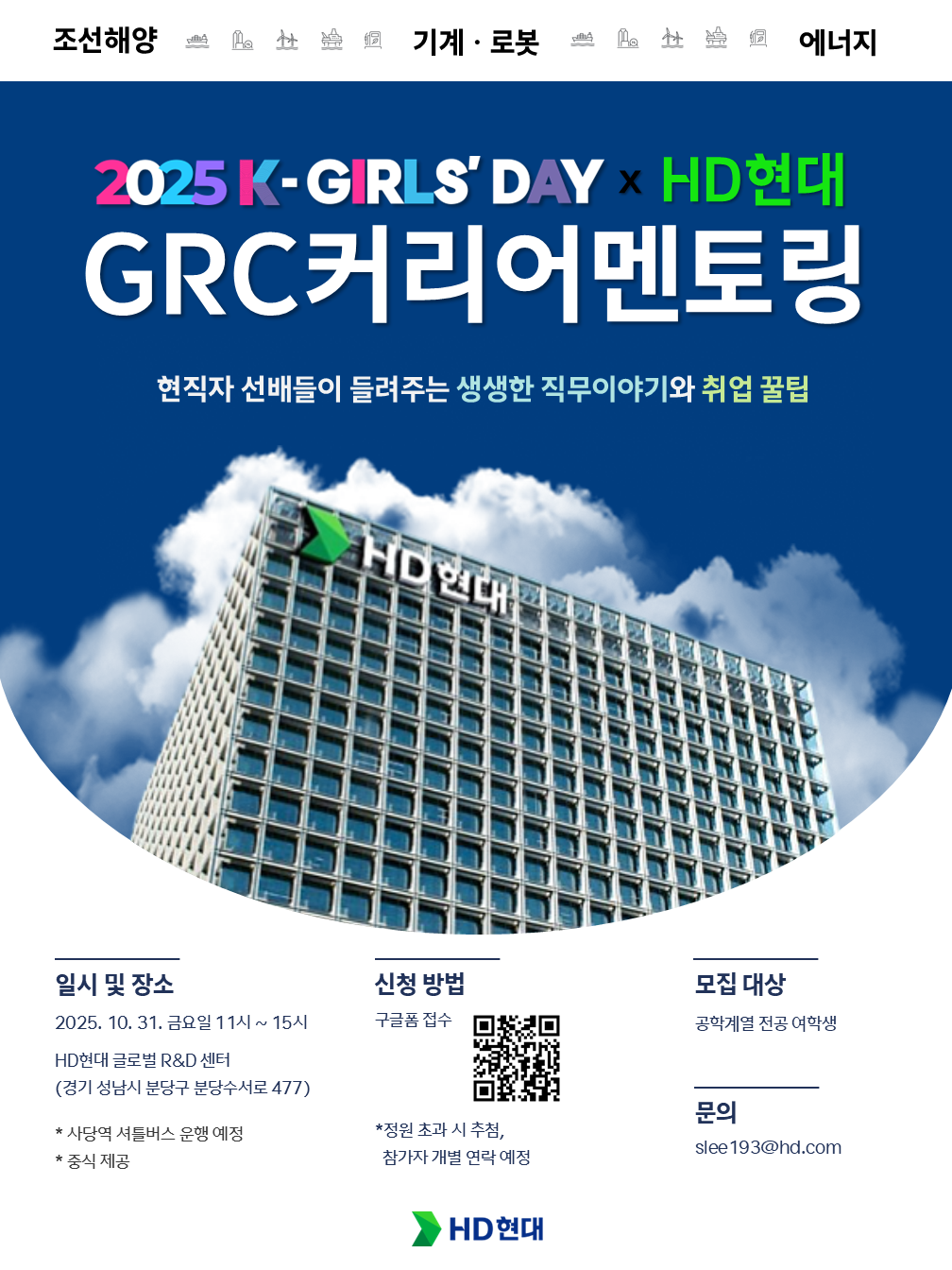 HD현대에서 2025 K-Girls' day 행사와 연계하여 GRC 커리어 멘토링을 진행하여, 행사 참가자(공학 계열 여성)를 모집합니다.