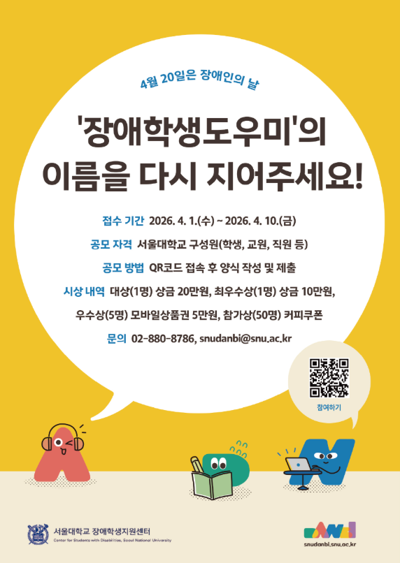 장애인의 날(4월 20일)을 기념하여 장애학생 지원인력 네이밍 공모전을 실시하오니, 서울대 전 구성원의 많은 관심 바랍니다.