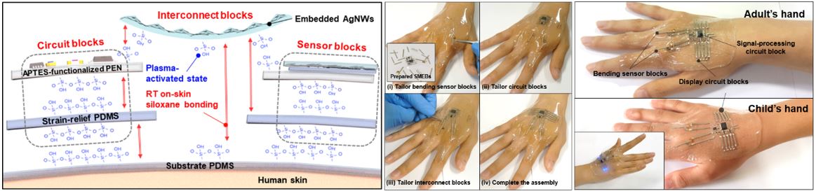 이와 함께 신호처리 회로 블록, 디스플레이 블록, 구부림 센서 블록, 신축성 전극 블록 등 주요 기능을 갖는 유연 모듈화 블록을 이용해 사용자의 신체 부위 위에서 산소 플라즈마 처리를 통한 접착 기술로 수 분 내에 전체 웨어러블 기기를 바로 조립할 수 있는 방법을 제시했다.
