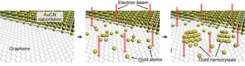 First, the researchers synthesized a nanoribbon (AuCN) that reacts with an electron beam on top of graphene to release gold atoms. When filming with a transmittal electron microscope begins, the phenomenon of producing nanocrystals begins when gold atoms gather on graphene. By analyzing these images, you can observe the birth of gold nanocrystals.