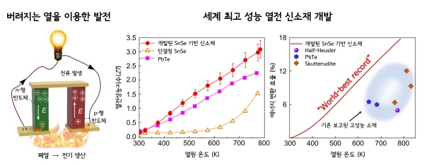본 연구에서는 다결정 소재들이 낮은 성능을 가지는 근본적 원인을 밝히고, 이를 원천적으로 해결하는 새로운 합성 공정법이 개발됐다. 그 결과 해당 신소재는 역사상 최초로 열전성능지수 3.1이 넘는 초고성능 발전 성능을 보였으며, 열에너지를 전기에너지로 변환하는 발전 효율이 20%를 넘는 세계 최고 기록을 나타냈다.