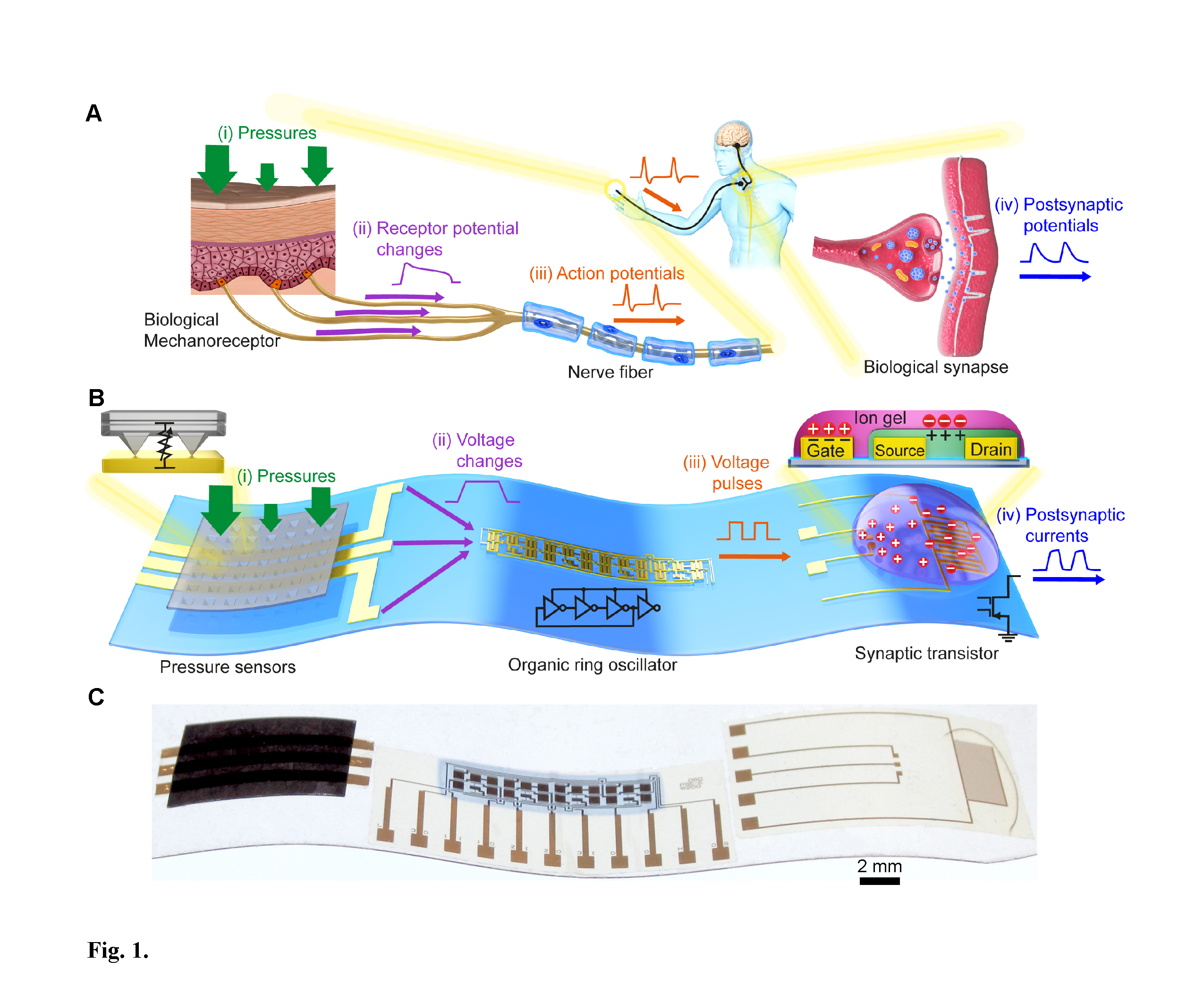 (B) An artificial mechanosensory nerve. Pressure sensors, organic ring oscillators, and synaptic transistors mimic biological mechanoreceptors, biological neurons, and biological synapses, respectively. The same colors represent corresponding parts.