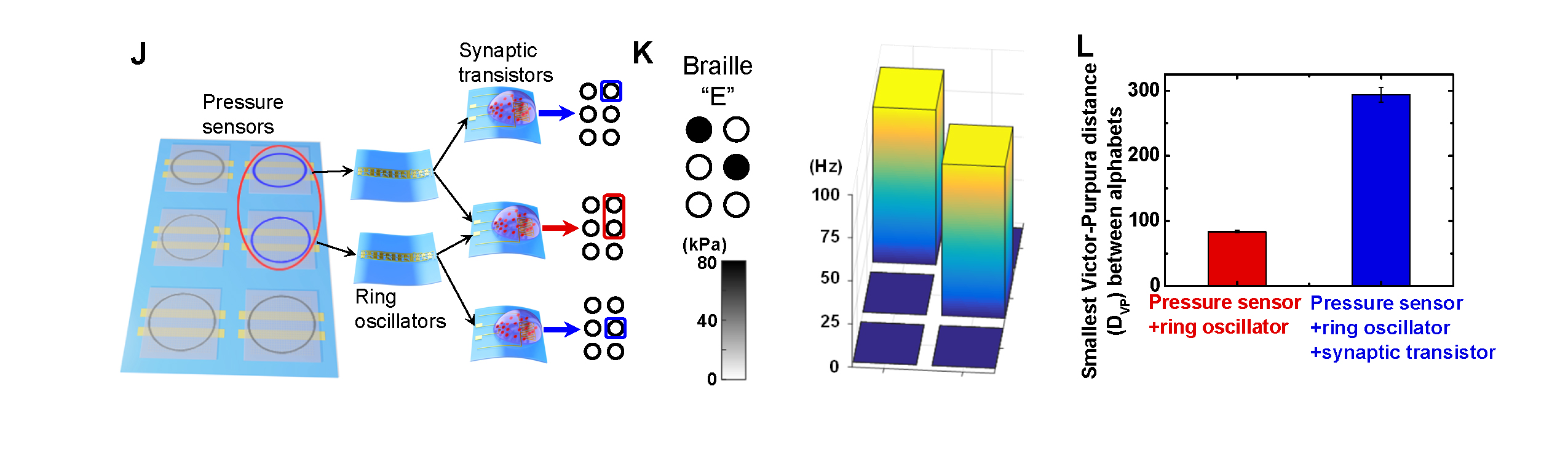 (J) An artificial mechanosensory nerve with a pressure sensor array of 2 × 3 pixels. Ring oscillators and synaptic transistors were connected to the pressure sensors and process the pressure information.
