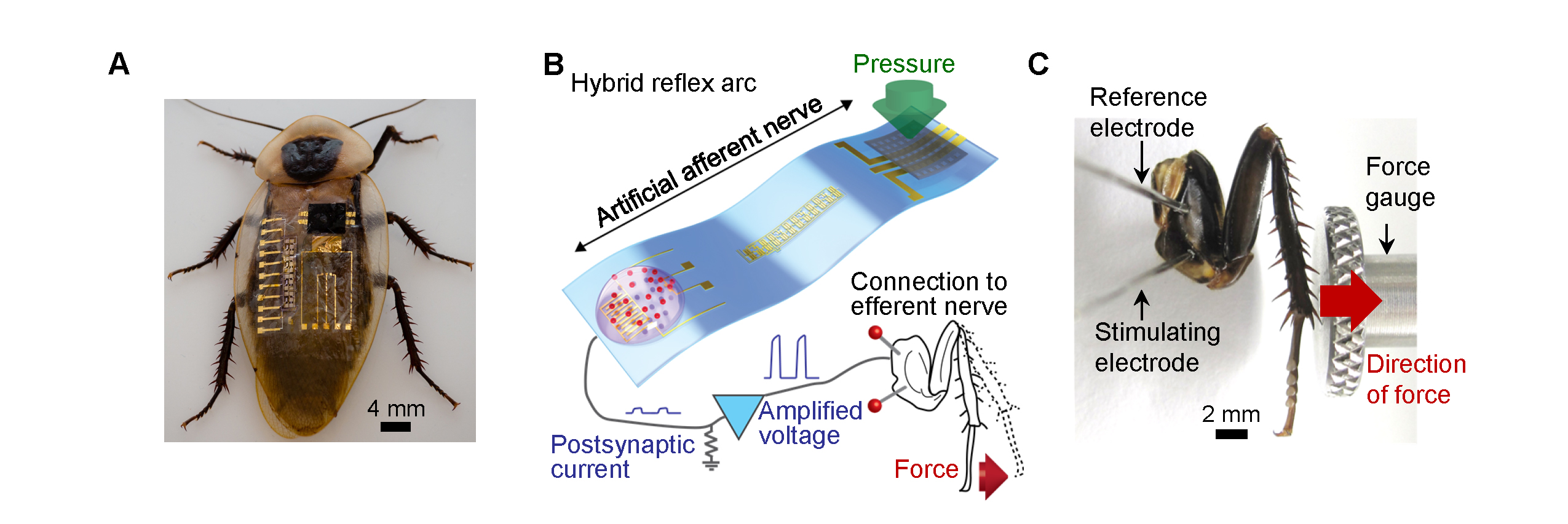 (B) An artificial mechanosensory nerve was connected to biological motor nerves to make a hybrid reflex arc and control the movements of a detached insect leg.